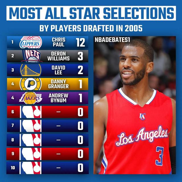 5 克里斯保罗斯入选全明星赛。 12 德隆威廉姆斯 3 次,大卫李 2 次,格兰杰 2 第二,安德鲁拜纳姆 1 第二。如今,安德鲁拜纳姆 37 年纪大了,曾经年轻有为,可惜,不够自律和傲慢,导致他在巅峰时期无球可打。