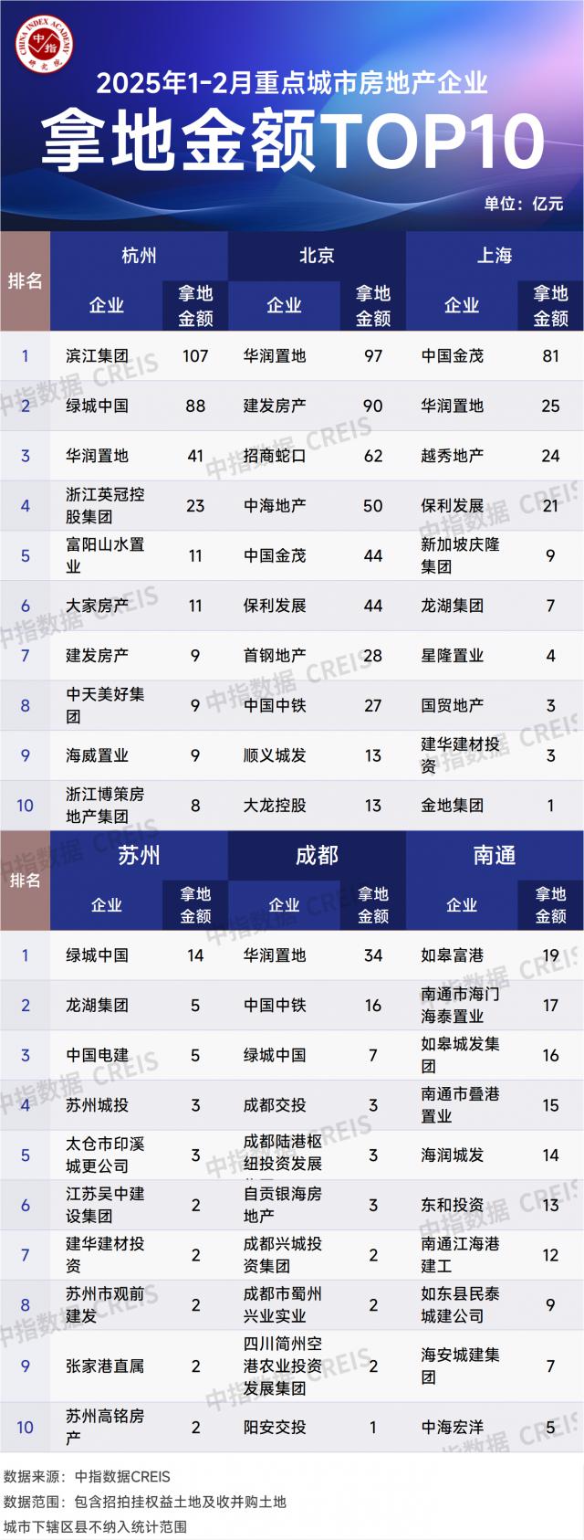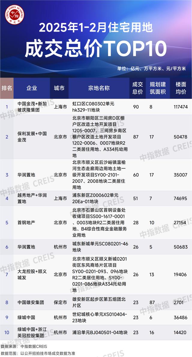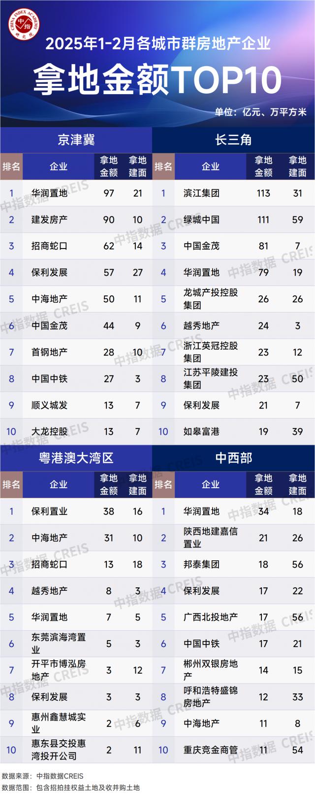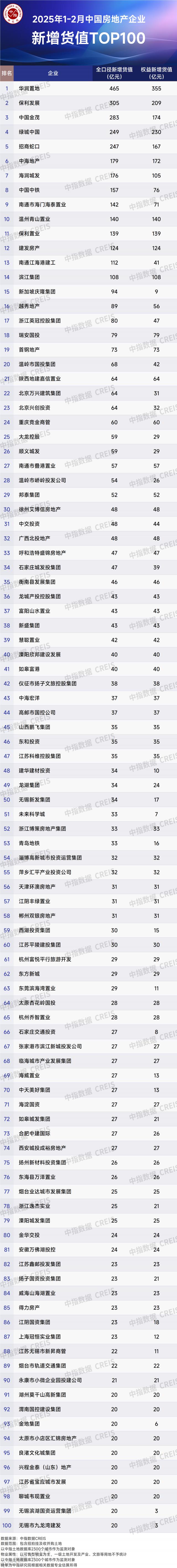 2025年1-2月,全国房地产企业拿地TOP100排名榜单