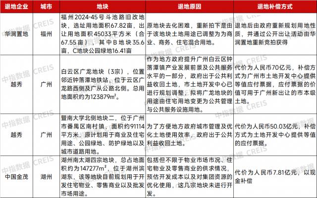 根据房地产企业的实践,2024 年 5 月 17 到目前为止,房地产企业可以通过退地盘活项目,提高土地储备结构,实现政府和公司的双赢。通过改变土地使用性质的退地重拍,实现项目的盘活。如 2024 年 7 月到 10 月华润置地在申请撤出一块取地十年的地块使用权后,再一次将该地块拍下,土地用途从商业上 商业变成了商品房 酒店 商务 商业。华润置地退地一方面是福州商品去化相对困难,当地写字楼空置率较高;另一方面,购物中心也趋于饱和。但是在“商改住”中再一次拍摄,可以很好地解决上述困难。与此同时,为鼓楼区捐赠建设的投资额不少于 3000 万的示范标杆小学,变相降低了征地成本。