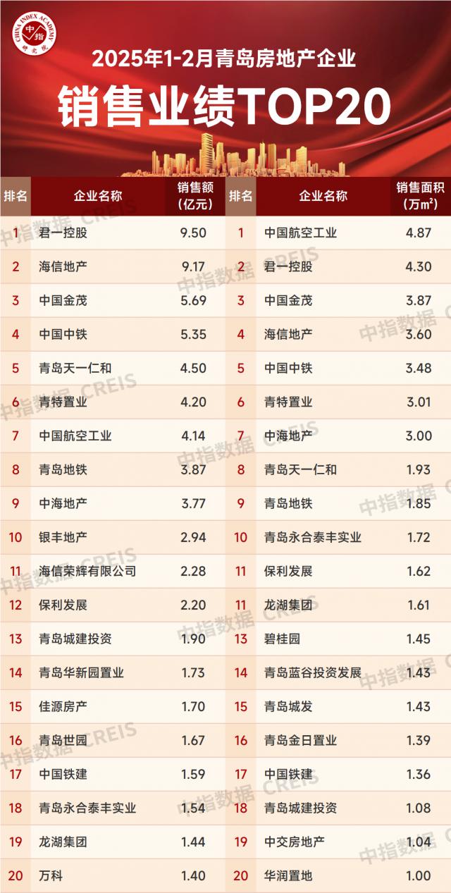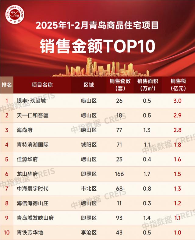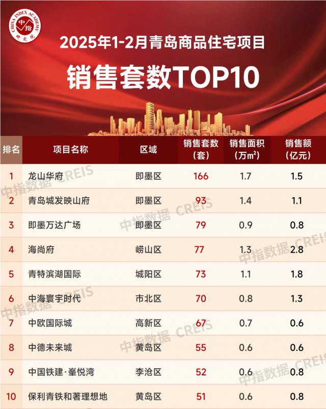 特别声明:房地产企业销售数据统计和项目销售数据统计均为 2025 年 1 月 1 日 -2 月 28 商品房合同在日期间销售的主要依据,中指数据 CREIS(点击查看)青岛的销售统计数据;参照企业提供的相关数据,公司将提供少数未在监测范围内的项目相关文件,经审核纳入统计范围,集中在线签约的已售罄项目不纳入名单。本报告仅供参考,不承担使用报告及其内容造成的任何直接或间接损失的责任。