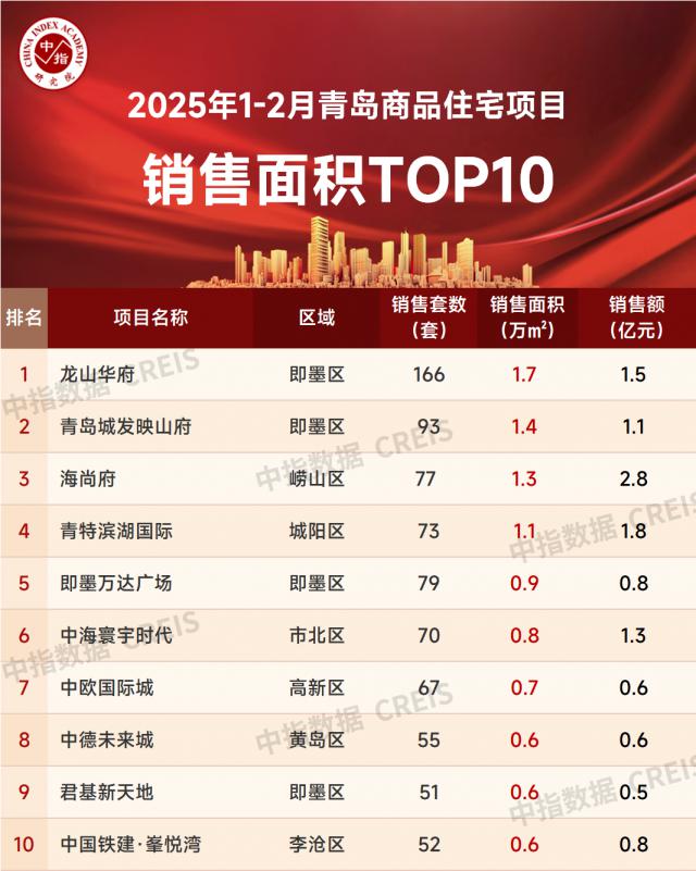 2025 年 1-2 月份,青岛商品房销售面积 TOP10 总销售面积为 9.8 万平,排名前三的项目销售面积都超过了。 1.3 万平。龙山是其中之一 · 华府获得销售面积冠军,销售面积冠军 1.7 万平;青岛城发映山府 1.4 万平排名第二;君一控股 · 海尚府以 1.3 万平的销售业绩紧随其后。