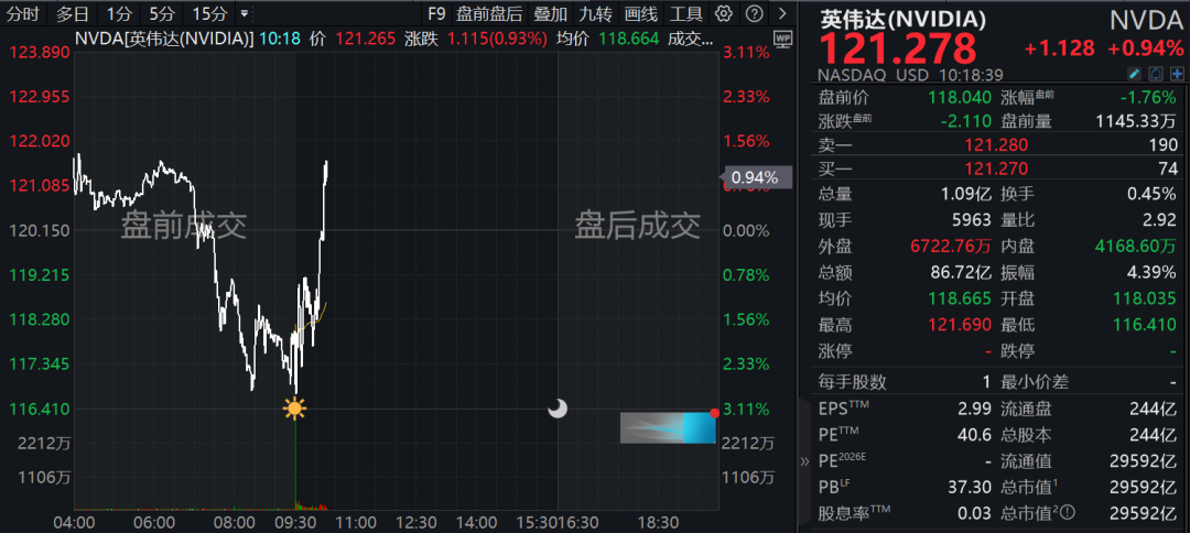 英伟达盘前一度下跌超过3%,截至发稿时已转涨。