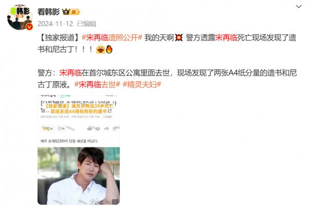 2024 年 11 月 12 当红年轻演员宋再临也被发现在家中留下遗书自杀。
