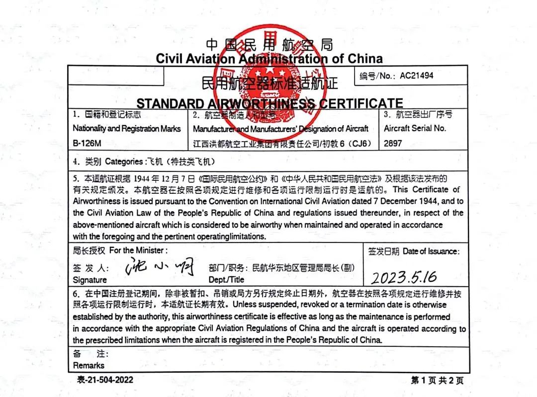 初教6号飞机于2月28日获得中国民航局颁发的TC/PC证书(型号证书/生产许可证)。