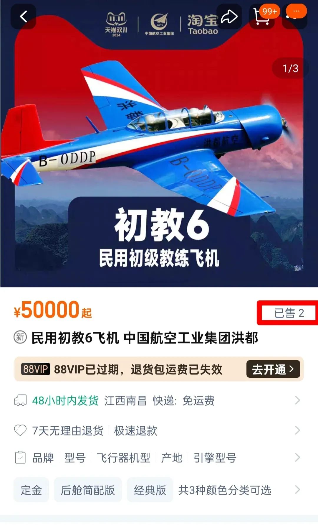 十一月十一日,民用初教6上线中航工业集团企业店后,首次实现2架线上销售。