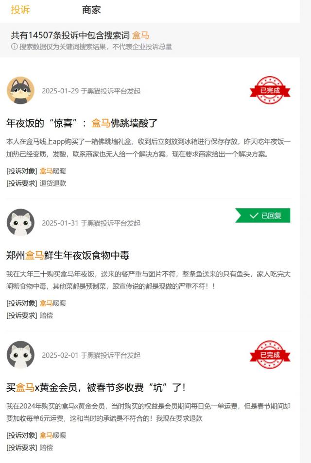 根据黑猫投诉平台,有超级超级 1 一万条投诉包括搜索词“盒马”。