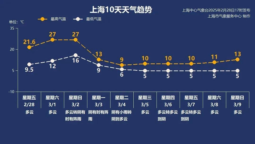 周末最高气温可达27~28℃。3日,气流向海洋迁移,引导冷空气南下。气温明显下降,全天气温在9~13℃之间。3月2日至3日,气温急剧下降近20℃。4-5日上午,中心城市最低气温为5。~6℃。