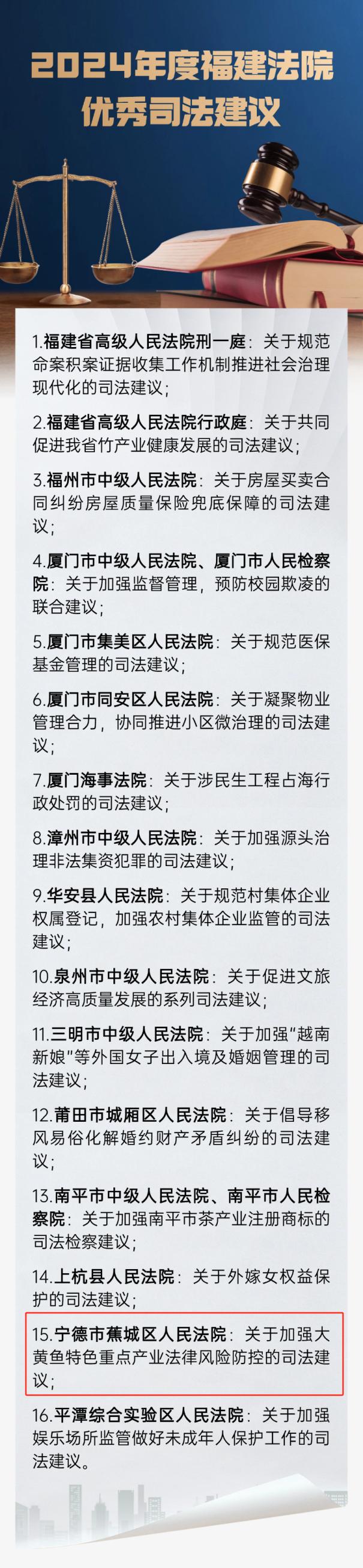近日,福建省高级人民法院公布了优秀司法建议评选结果。其中,宁德法院一项司法建议被评为“2024年全省法院优秀司法建议”。