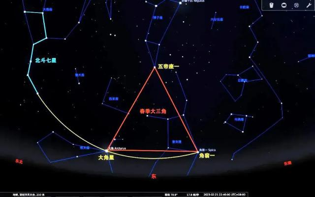 沿北斗七星的勺柄曲线延伸,可找到牧夫座 α,这颗星通常被称为“大角星”。