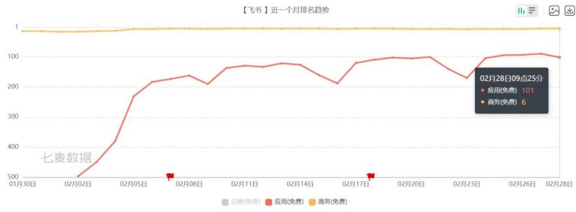 以飞书为例,据七麦数据显示,2月初在苹果App上。 Store免费排行榜超过500名;2月7日接入DeepSeek后,它被拉升到200名左右。接下来的20天震荡上升,现在已经跻身TOP100。