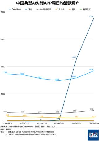 根据QuestMobile的数据,2月3日至2月9日,文小言的DAU为123万,元宝仅为22万;DeepSeek高达3780万,豆包也有1845万。DeepSeek的DAU是文小言的31倍,相当于元宝的172倍。