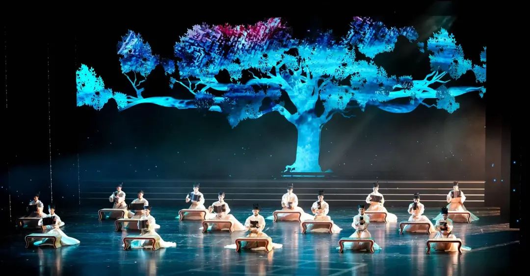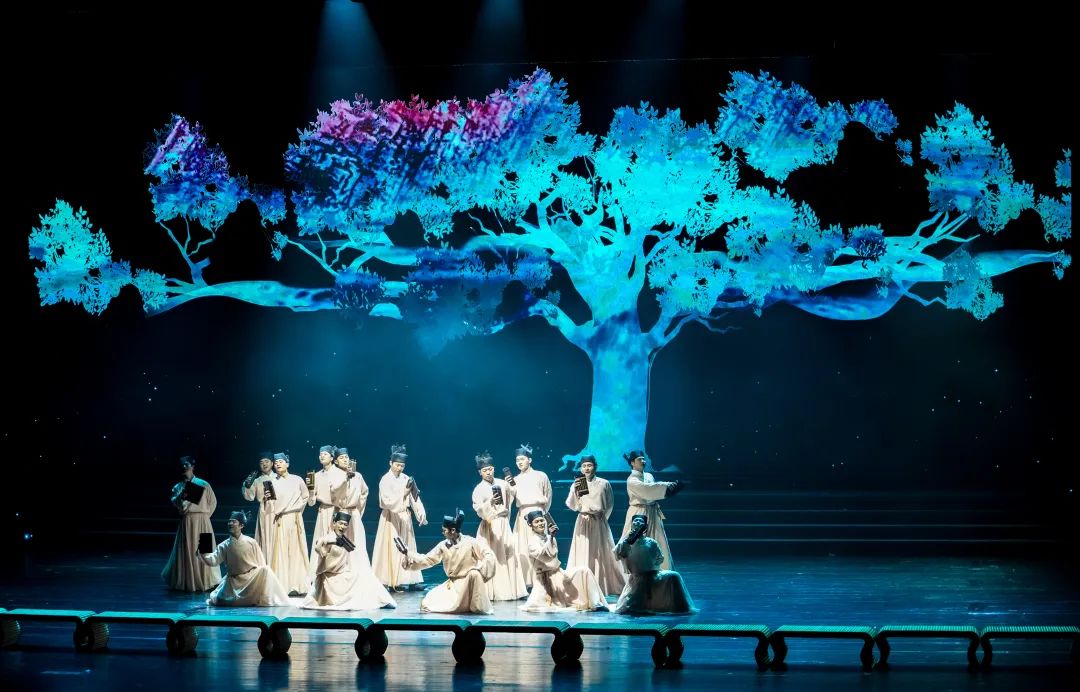 科技与文化交相辉映,在“江准之春”的舞台上,美轮美奂,也展现了合肥文化、艺术的繁荣与科技创新的活力。当全息投影的“生命之树”在舞台中央伸展枝叶时,舞者们有时在音乐节拍中优雅洒脱,有时英勇磅礴,诠释了年轻学生努力学习、坚韧不拔的活力。舞台上移动冰屏同步呈现《朱子家训》的动态书法,让古书中的文字随着舞蹈节奏“活”起来。