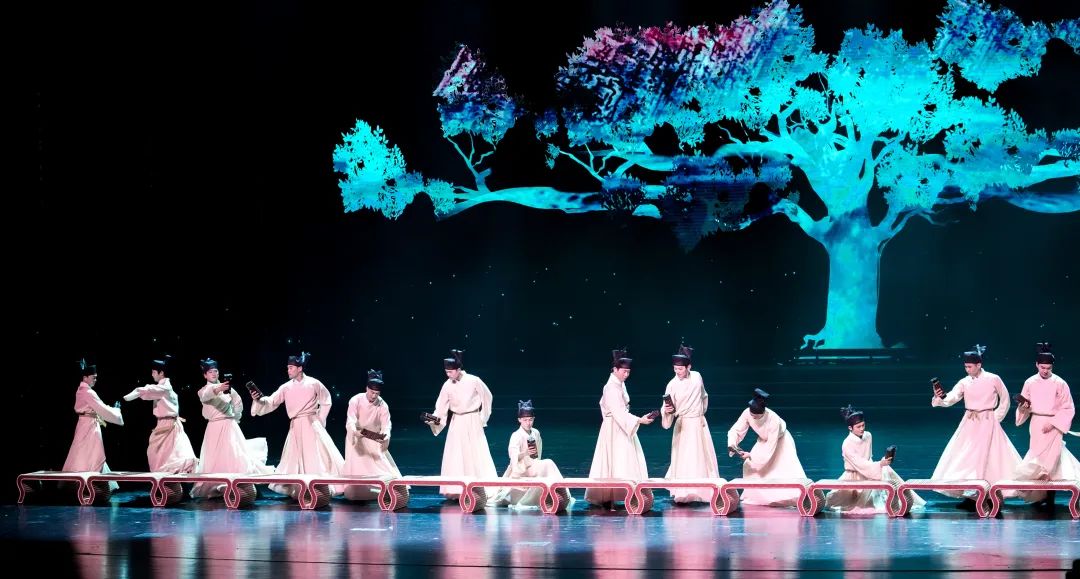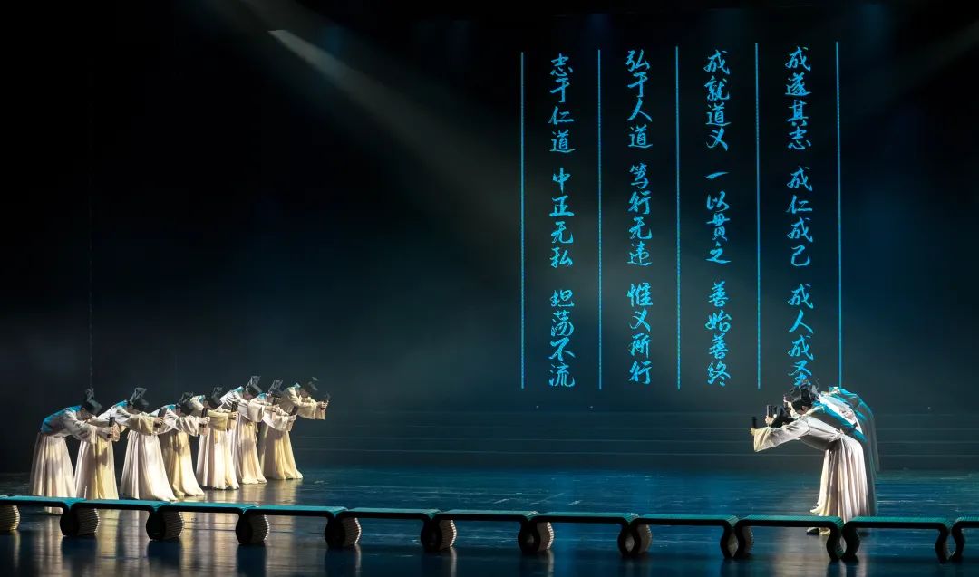 当舞台灯光越来越暗的时候,穿着深色衣服的朱雷手里拿着竹子,站在新时代的年轻学生之间,讲述了“修六礼”的典故:“古人向老师学习需要干肉、芹菜等六礼,这不仅是物质礼物,也是学习之心的郑重表达。“话刚说完,舞台纱幕在古琴的声音中缓缓升起,数十名舞者化身宋代学生,呈现出轻盈的舞蹈,用“对抗仪式”向老师致敬,仿佛置身于古代学校,与朱子一起去了一次“格物致知”的哲学之旅。