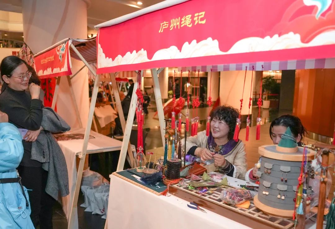 “庐州绳记”代表性传承人岳红在现场非遗展区向观众展示绳艺作品。