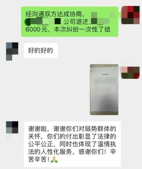 经过一个多小时的讨论,被告在得知与吴某签订并履行合同后,当场退还了6000元押金。吴某比“OK”手势,以表达对案件处理结果的满意。