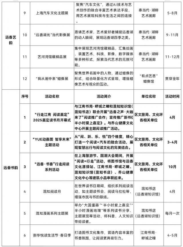 以全民阅读为主题,结合世界阅读日、上海书展、上海旅游节等时间节点,“走江南” 阅读嘉定" 2025 嘉定读书月开幕式," YUE 动嘉图 “智享未来”活动,“远香” · “行走阅读系列活动、新华悦读生活节系列活动、混知阅读月、漫画系列主题展等活动。