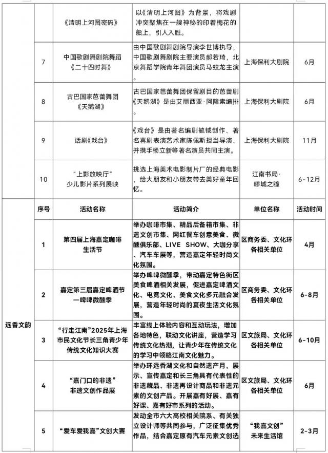 第四届上海嘉定咖啡生活节、第三届嘉定啤酒节、2025年举办,以文化节展为主题,结合端午节、国庆节、中秋节、元旦、咖啡文化节等时间节点。 上海市民文化节长三角青少年传统文化知识大赛、“爱车爱我嘉”文化创意大赛、“嘉门前的非物质文化遗产”非物质文化创作展、“远香有礼”文化市场等活动。
