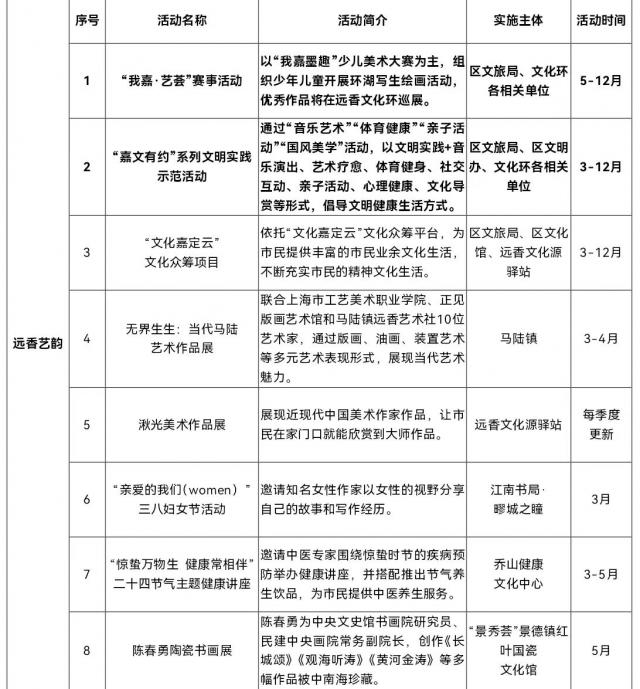 以艺术展、艺术美育为主题,结合三八妇女节、汽车文化节等时间节点,举办“我嘉嘉” · 艺汇系列赛事、“嘉文有约”系列文明实践示范活动、“文化嘉定云”文化众筹项目、“无界生活:当代马陆艺术展”、“亲爱的我们(women)“三八妇女节、陈春勇瓷器书画展等活动。