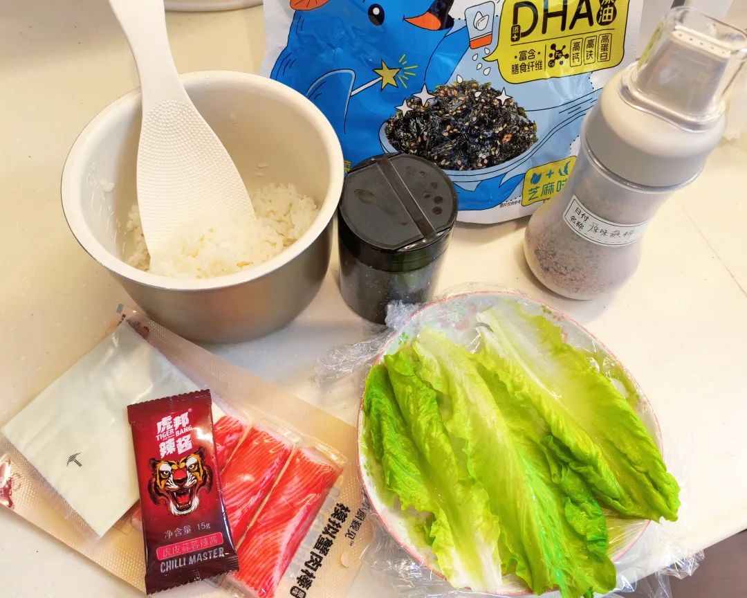 米饭(也可以放一半的糯米)、生菜、拌饭海苔、芝麻、烧烤撒料(可以换成椒盐、味精、芝麻粒)、奶酪片,蟹柳棒,辣酱(可以换成色拉酱,番茄酱,韩式拌饭酱等)。
