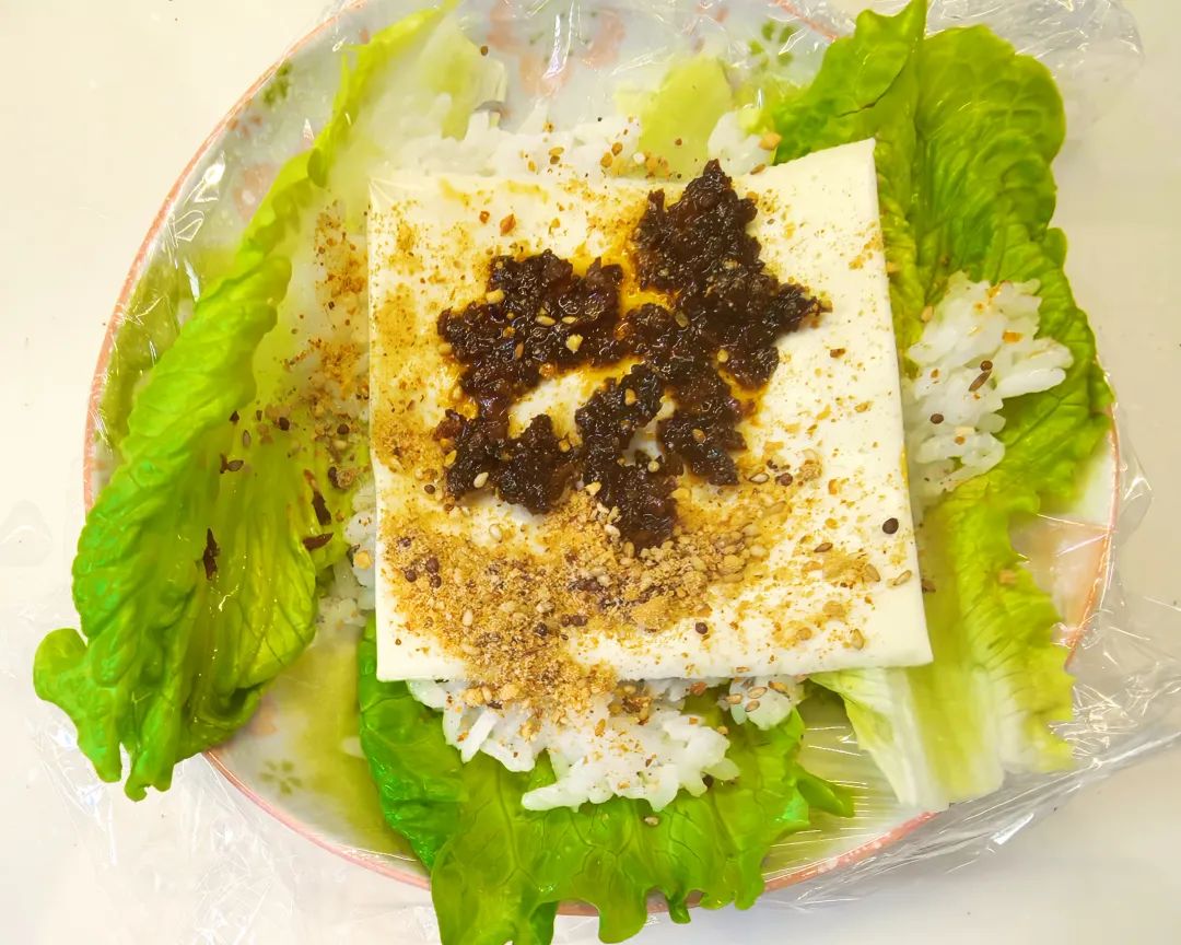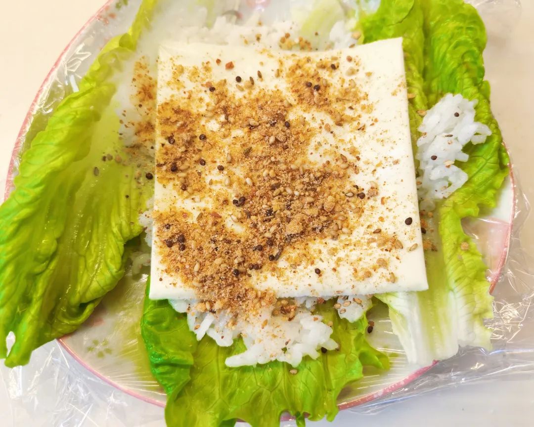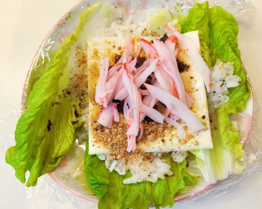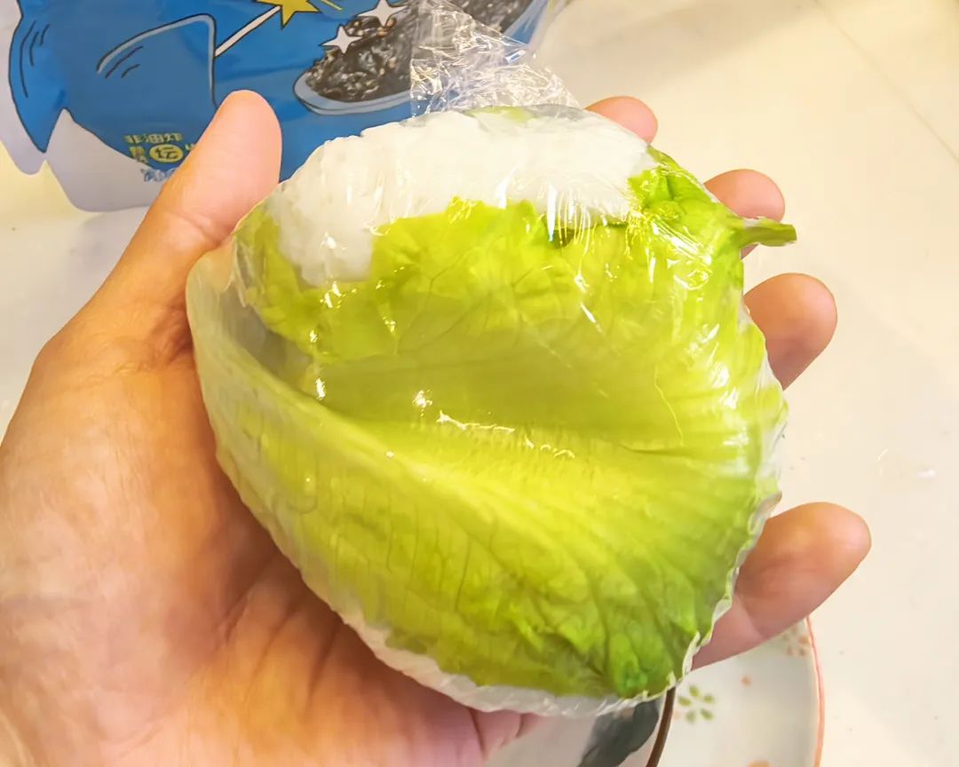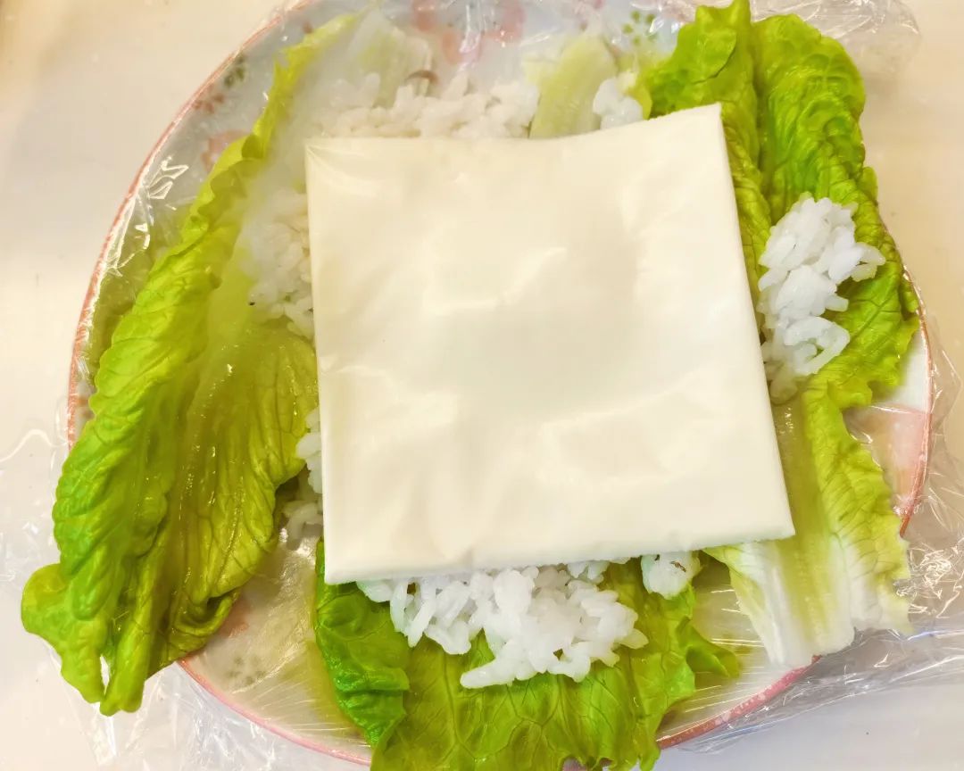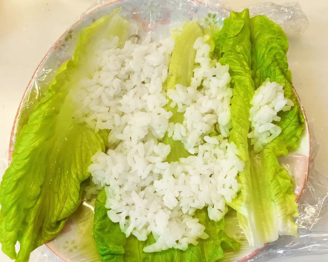 食品级耐高温保鲜袋盖在盘子里,用生菜做底,铺上少量米饭。