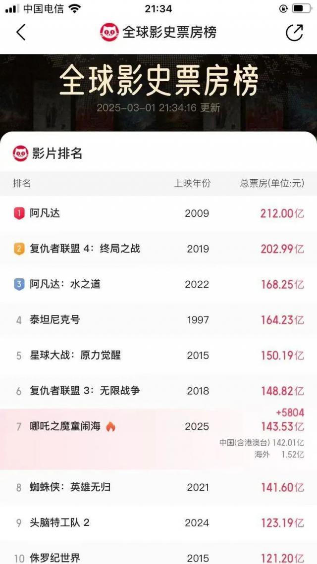 破143亿元的《哪吒2》,世界第七!新西兰的票房力压美队4
