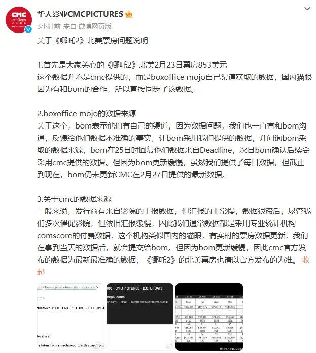 关于 cmc 一般来说,发行商有来自电影院的报告数据,但报告非常缓慢,数据非常滞后。虽然我们多次催促电影院,但报告仍然很慢,所以我们通常使用专业的统计机构。 comscore 付费数据,这个机构类似于国内猫眼,有实时的票房数据更新。我们在获得当天的数据后,会提交给它。 bom。但因为 bom 更新缓慢,所以 cmc 正式发布的数据是最新最准确的数据,哪吒 北美的票房也要以官方公布为准。