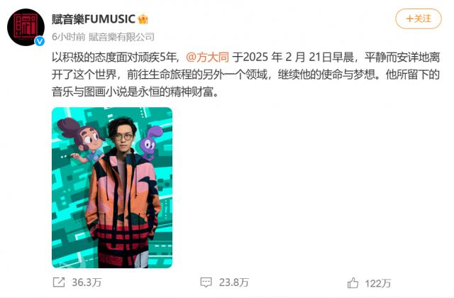 3 月 1 日本,方大同经纪公司“赋音乐” FUMUSIC "发表了φ告:"并以积极的态度与疾病作斗争了五年, 2 月 21 早晨平静地死去了。”