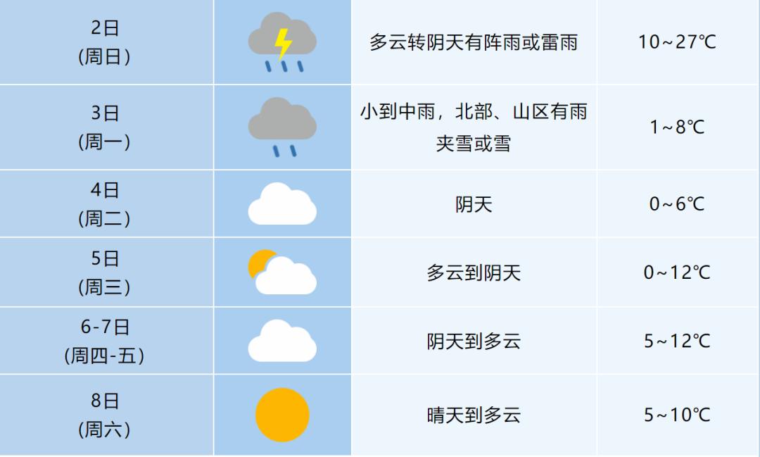 2日(周日):淮北沿淮北阴天有中雨,部分地区暴雨至暴雨,其中淮北西北部夜间有雨转雨夹雪或雪;淮河以南阴天小到中雨,其中大别山区和江南部分地区暴雨,部分暴雨。