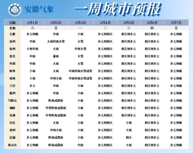 3日(周一):全省阴天。淮北有中雨夹雪或雪,部分地区有大雪到暴雪;淮河以南有小到中雨,大别山区和江淮之间有雨夹雪或雪。