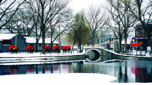 图片:银锭桥下的游船 下图:2008 年银锭桥雪景
