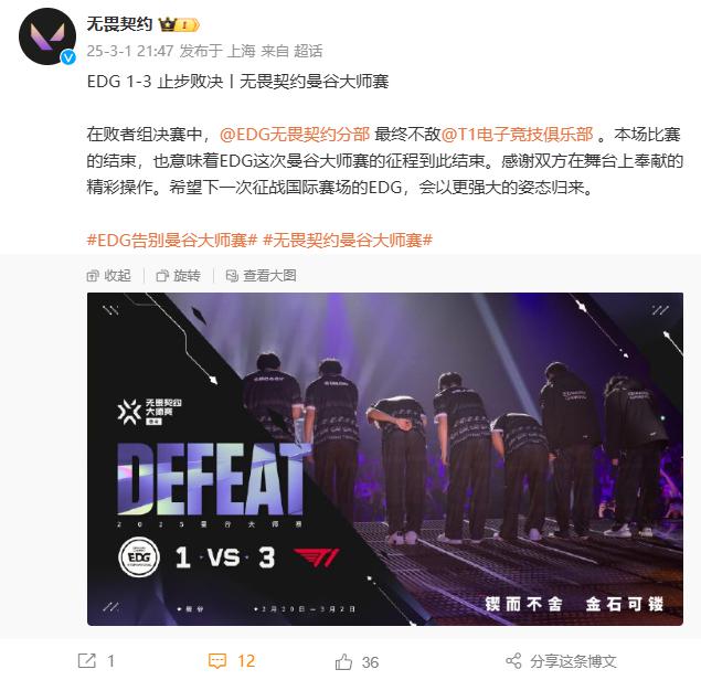 EDG曼谷大师赛《无畏契约》 1:3 不敌 T1 停步败决