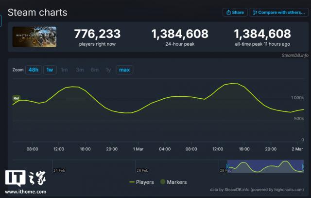IT 世家 3 月 2 每日消息,根据 SteamDB 资料,《怪物猎人:荒野》游戏 2 月 28 每天上线的第一天,Steam 同时,平台在线玩家的峰值达到 1307976 人。