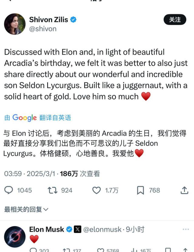 Shivon 宣布:与 Elon 讨论之后,考虑到美丽。 Arcadia 我们认为最好直接分享我们优秀而不可思议的孩子的生日。 Seldon Lycurgus。身体强壮,心地善良。我爱他。
