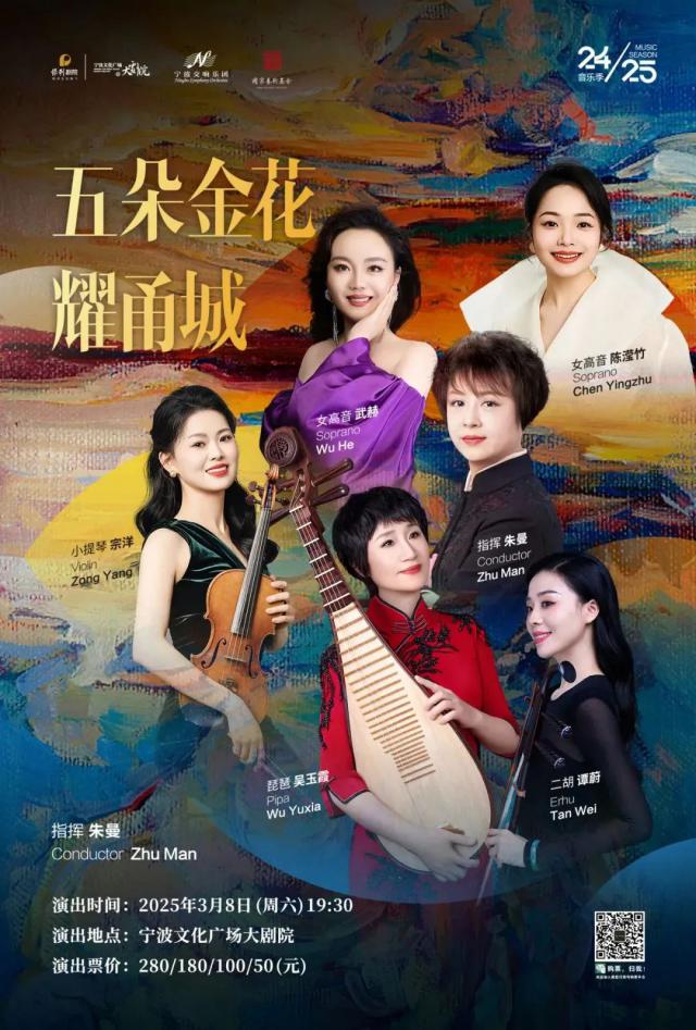 国家一级指挥员朱曼担任“五朵金花”音乐会指挥员,著名琵琶演奏家吴玉霞、二胡演奏家谭蔚、女高音演唱家武赫、女高音演唱家陈竹、宁波交响乐团助理首席宗洋、二胡演奏家刘蕾共同出演。