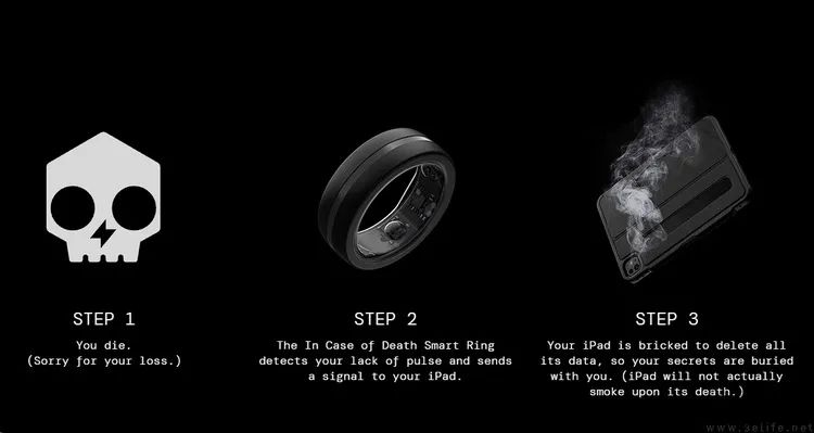 据Zugu介绍,该套装中的智能戒指将全天候监测客户的身体状况。一旦发现钻戒还戴在手里,但心率突然停止,血氧和体温急剧下降,软件就会判断客户“正在死亡”(虽然Zugu说他们的钻戒可以区分主动摘下的情况,虽然我们对此表示怀疑)。