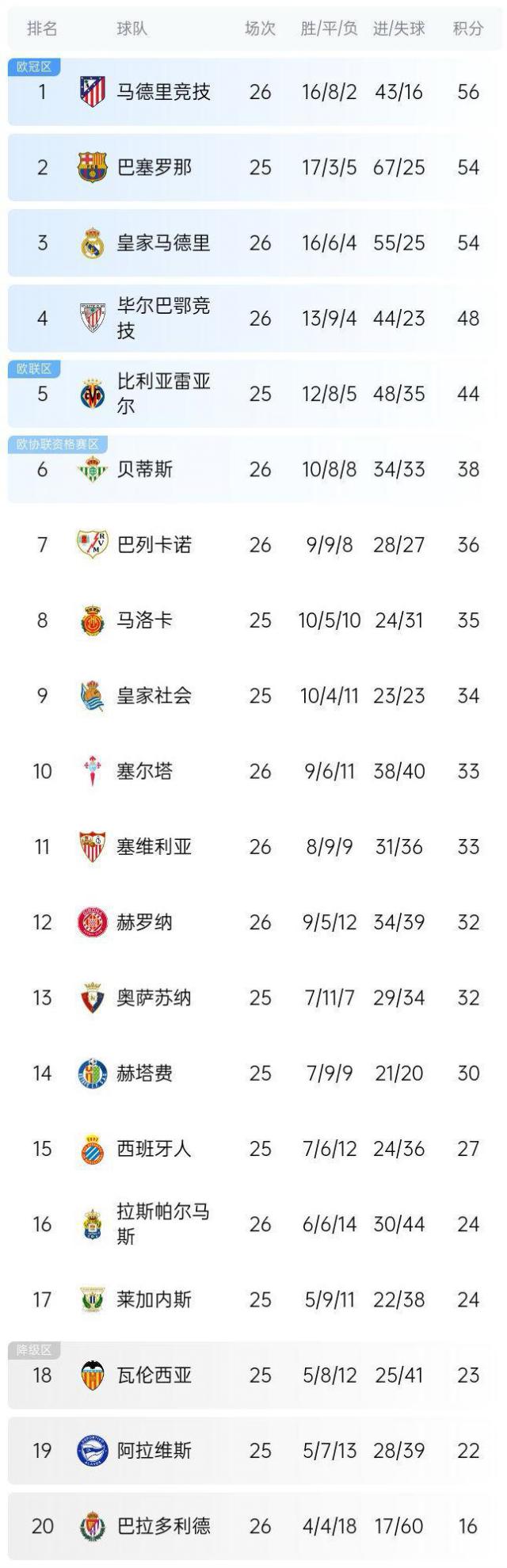 马竞积 56 反超巴萨,皇马(同积分) 54 得分),重回榜首,其中巴萨少赛一轮退至第二,皇马本轮输球跌至第三。另外,毕尔巴鄂积 48 分数仍然排在第四位,也给了比利亚雷亚尔缩小分差的机会。