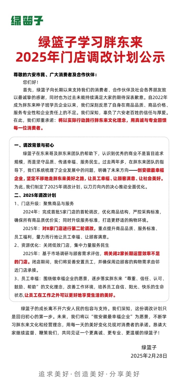 在过去的几年里,在胖东来团队的指导下,绿篮子系统梳理了公司发展中的问题,明确了未来的方向——创造安徽最幸福的企业,坚定不移地走上了胖东来美好的道路,让员工快乐,让客户满意,让社会变得更好。于是,绿篮制定了2025年调整计划,以刀刃向内的决心推进全面优化。绿篮子郑重承诺:将以实际行动践行胖东来的文化理念,以真诚和专业的方式回馈每一位消费者。