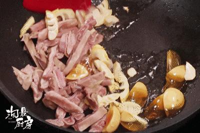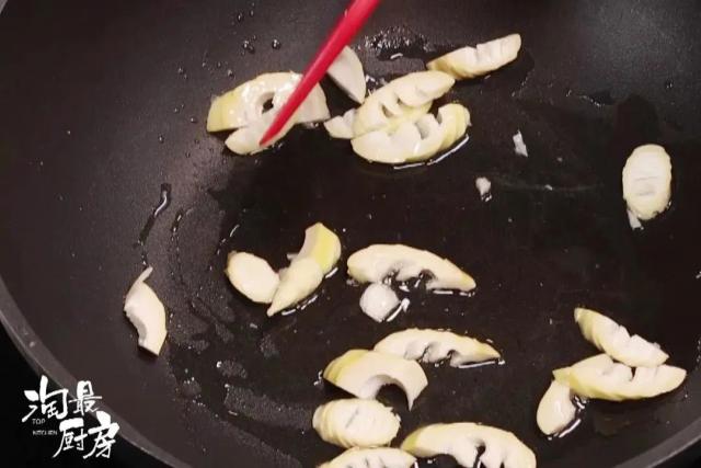 ❶ 锅里加 1.3 调汤(20ml)油,加入春笋片爆锅清除涩味。