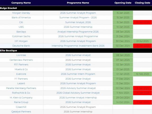 虽然有额外的机会申请暑期实习,但是申请时间线和爆炸一样紧凑。过去,华尔街投行的暑期实习申请一直持续到 9 月份。但2 月份还没有结束,已经接近了。 70 家庭投资银行开放 2026 2008年夏天的实习项目,甚至很多投行都关闭了申请渠道。: