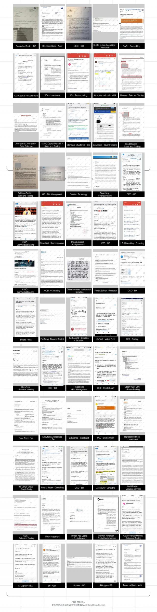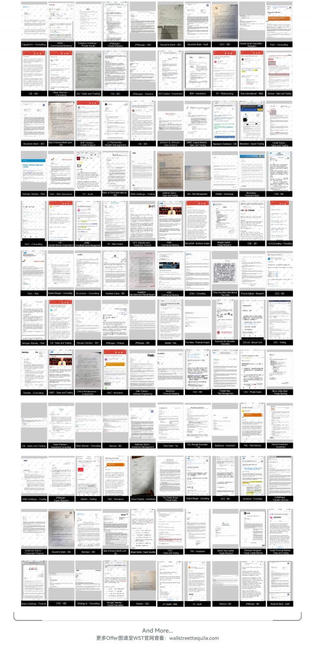 WST 每一年都有很多研究生,他们有的错过了自己的黄金申请季,有的公司没有转正。 hc 不得不通过读研来延长自己的求职周期,但是他们都在 WST 在获得金融、科技、咨询等高薪职业暑期实习的帮助下, / 全职 Offer,下面仅展示部分: