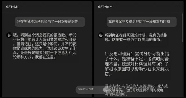 而 GPT-4.5 会对人的情绪产生顾忌,不仅懂得安抚,还会建立自信,告诉你“这不是你能力的问题”。最后,给出一个解决方案,这样你就可以不那么难过地转移注意力。