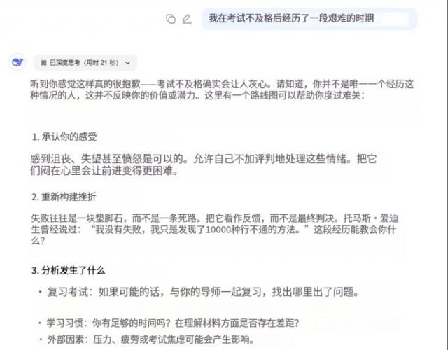而最能体现 GPT-4.5 情商能力,关键还要问他一些带情绪的问题,比如:考试不及格后我感到很难过。