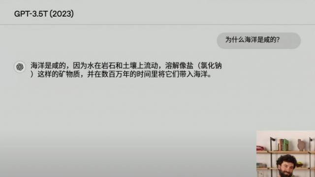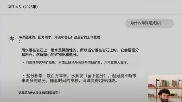在真正展示 GPT-4.5 之前,OpenAI 首先向我们展示了从 GPT-1 到 GPT-4.5 进化过程,看上去很有趣。她们问了一个常识性的问题:为什么海洋是咸的?
