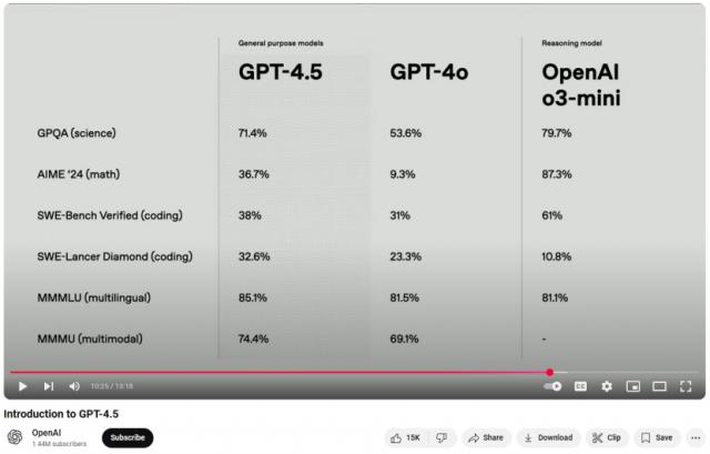 尽管号称在 GPT-4.5 使用了 GPT-4o 10 两倍的计算能力,但是我们可以看到整体数据,并没有得到很大的提高。