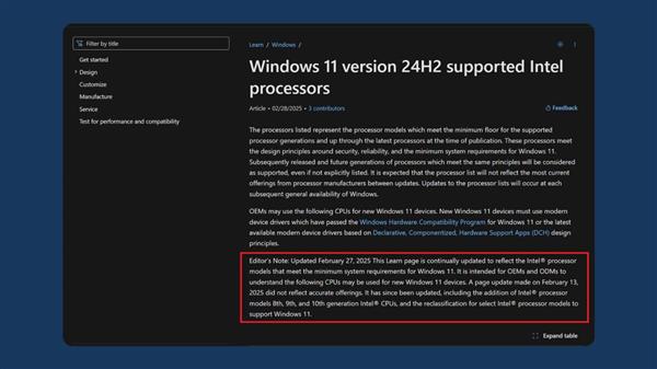 微软在" Windows 11 版本 24H2 支持的 Intel Cpu"更新说明在页面上发布,承认 2 月 13 日本页面更新未能准确反映支持的产品列表,并对以前的错误进行了调整。