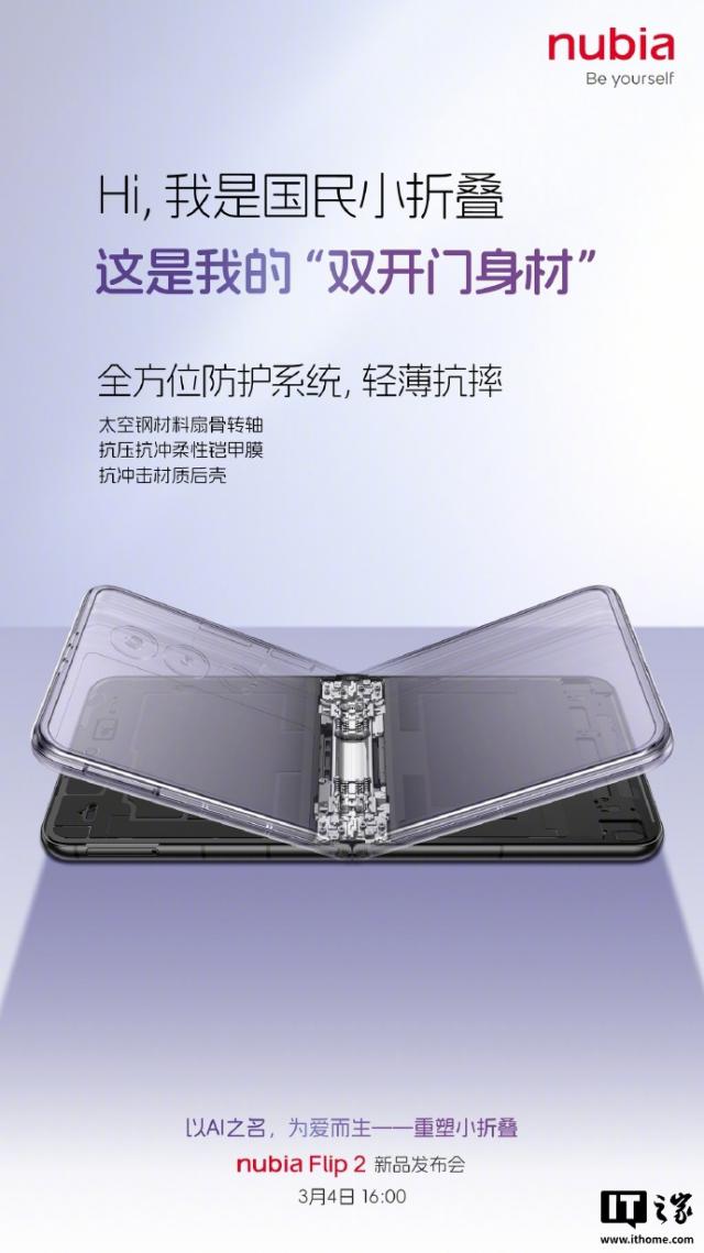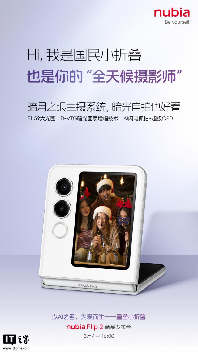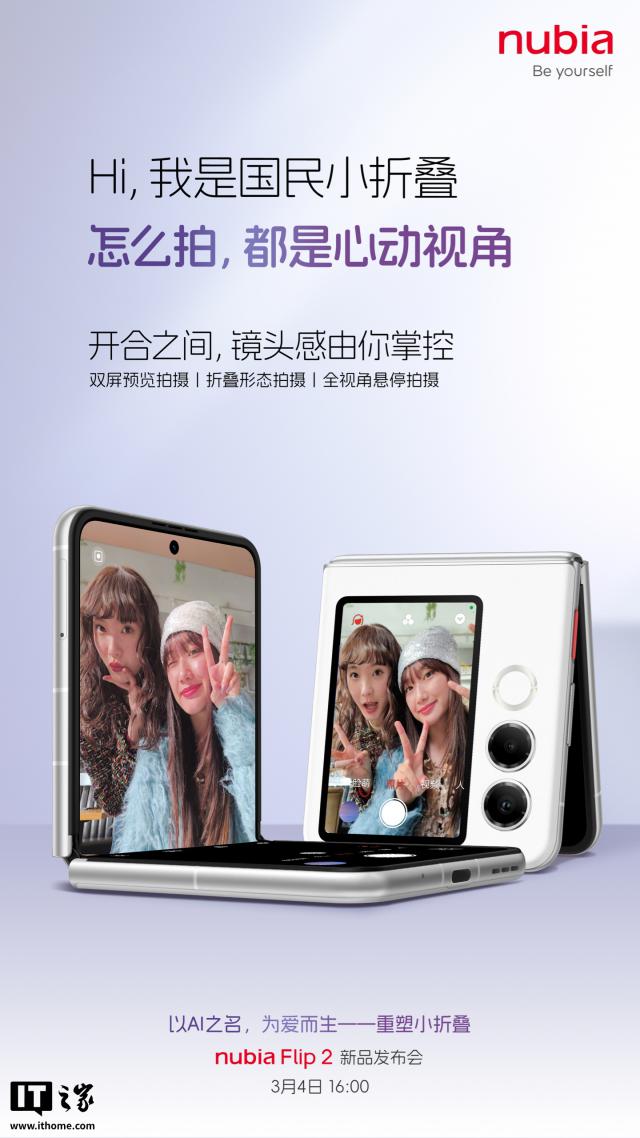 IT 世家 3 月 2 每日消息,努比亚 Flip 2 小折叠手机的外观已经正式公布,决定提供三种配色方案:雪钻白、星光黑、霜紫。新机号称“新一代国民小折叠”,将在 3 月 4 日 16:00 发布。