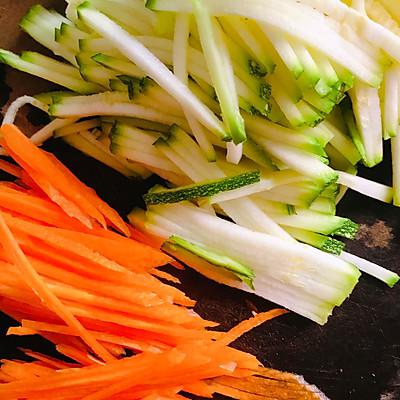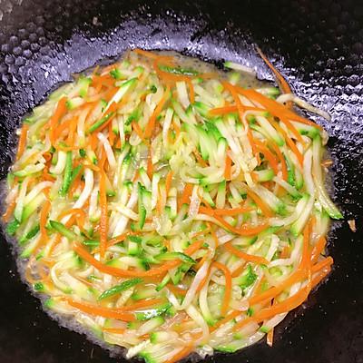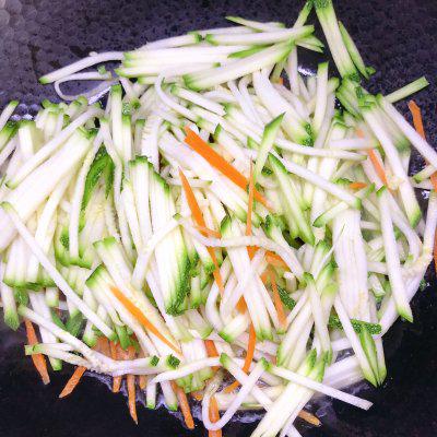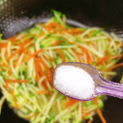 6、放入南瓜丝和胡萝卜丝,放入一勺鸡汤