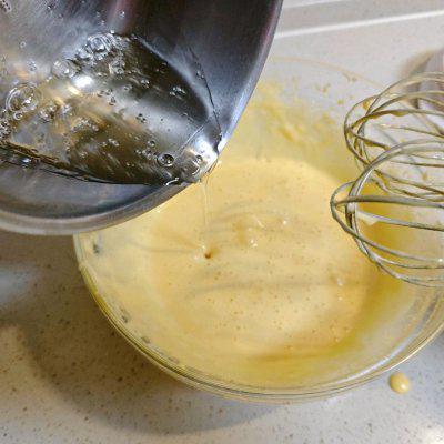 14、慢慢地将糖桨倒入蛋黄中,将蛋黄煮熟,边倒边搅拌。