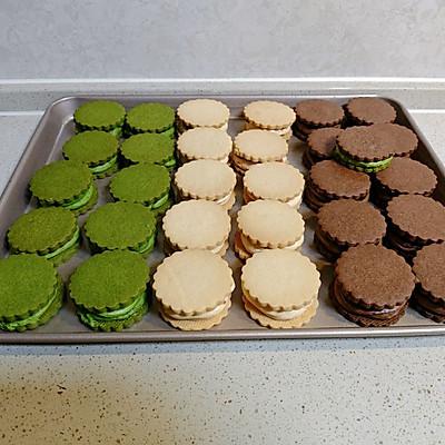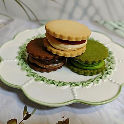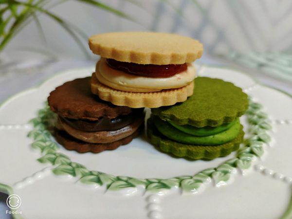 22、每块饼干都挤一层白脱奶油,然后挤一层甘心,再撒上辅料,再把两块饼干放在一起,就成了一个完整的白脱奶油饼干。 原味白脱饼干 : 原味饼干➕果酱白脱奶油霜➕果酱 抹茶白脱饼干 : 抹茶饼干➕抹茶白脱奶油霜➕抹茶甘纳许➕蜜豆或橘皮丁 巧克力白脱饼干 : 巧克力饼干➕巧克力白脱奶油霜➕甘纳许巧克力➕薄脆的巧克力或脆脆的巧克力珠。