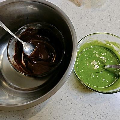 20、再次做甘纳许 甘纳许巧克力 : 淡奶油 35g ➕黑巧克力 隔热水融化65g。 抹茶甘纳许 : 淡奶油 35g ➕白巧克力 65g ➕抹茶粉 隔热水融化2g。